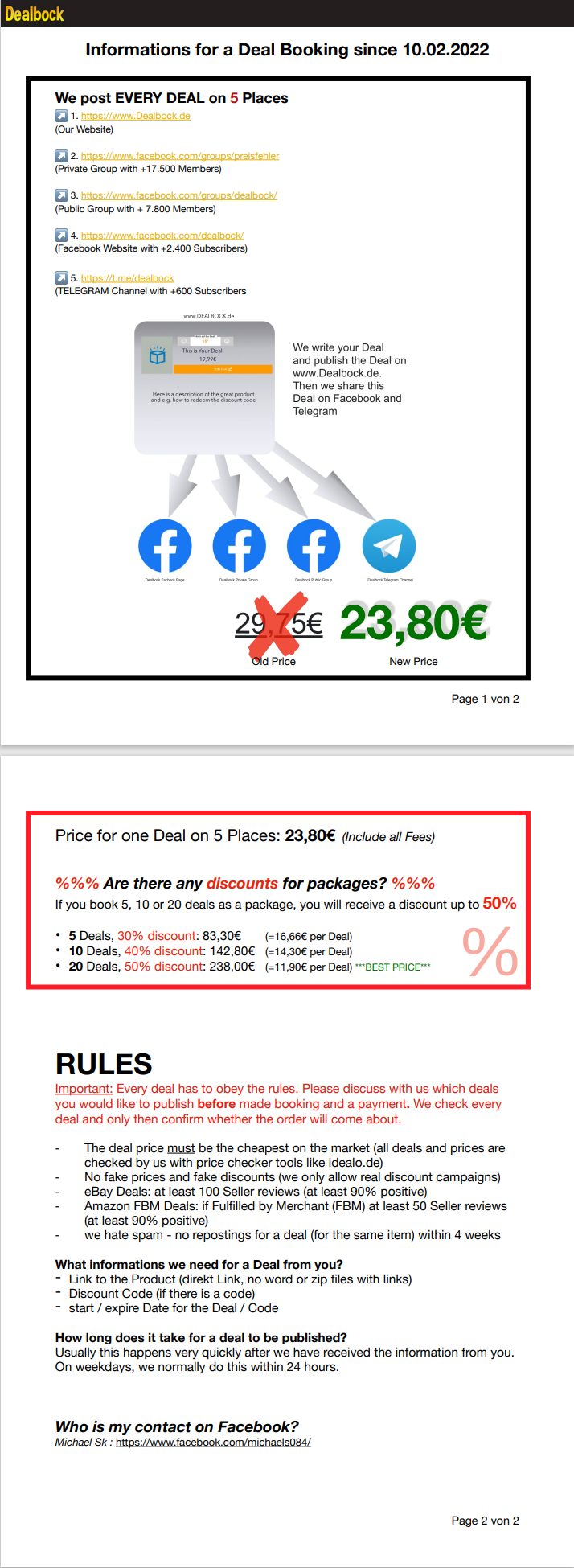 we post your deals for 90€ per Deal. If you buy a package of at least 10 postings we can make a discount (850€). Payment via Paypal or Bank (only package). We write the postings and they will appears directly on the mainpage on the blog with the other deals.