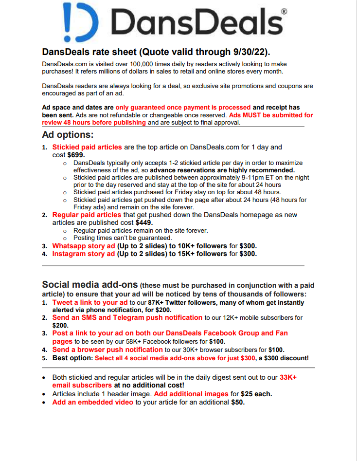 2-3 Sponsored Deals purchased at one time - $425 per Sponsored Deal